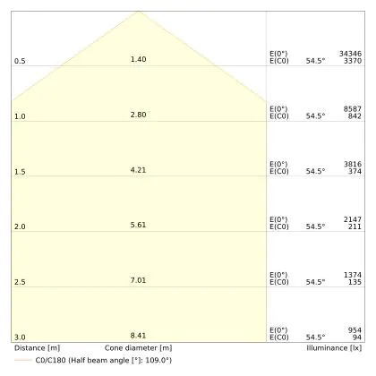 De gradenbundel geeft informatie over hoe breed het licht wordt uitgestraald. Dit zit tussen de 0 en 360 graden (D). Hoe kleiner de hoek, hoe specifieker de lichtbundel is. Over het algemeen is een smalle gradenbundel perfect voor sfeer- of accentverlichting, terwijl een brede gradenbundel ideaal is om grote oppervlaktes te verlichten.